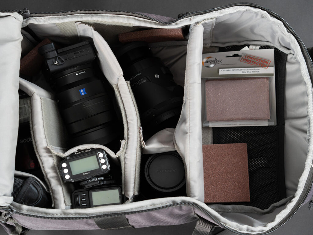Schutz von hochwertiger Kameraausrüstung mit dem INTERCEPT CI-Schaum. Kann in jede Kameratasche zum Schutz vor Korrosion und ESD eingebracht werden.