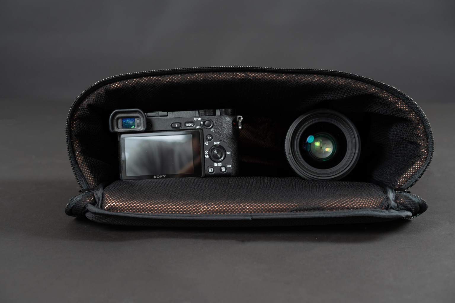Kameratasche mit intergriertem Korrosionsschutz durch INTERCEPT Beschichtung im Inneren der Tasche. Schützt sensible Elektronikkomponenten vor Alterung und schädlichen Umwelteinflüssen.