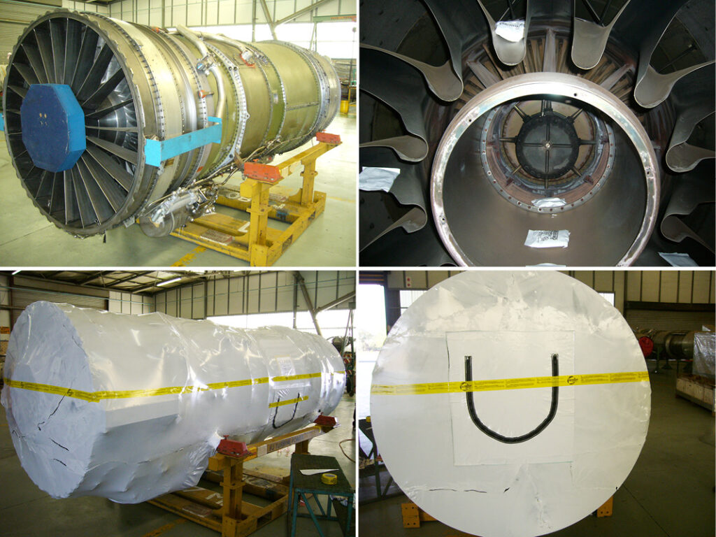 Transportverpackung einer Flugzeugturbine für den Überseetransport.